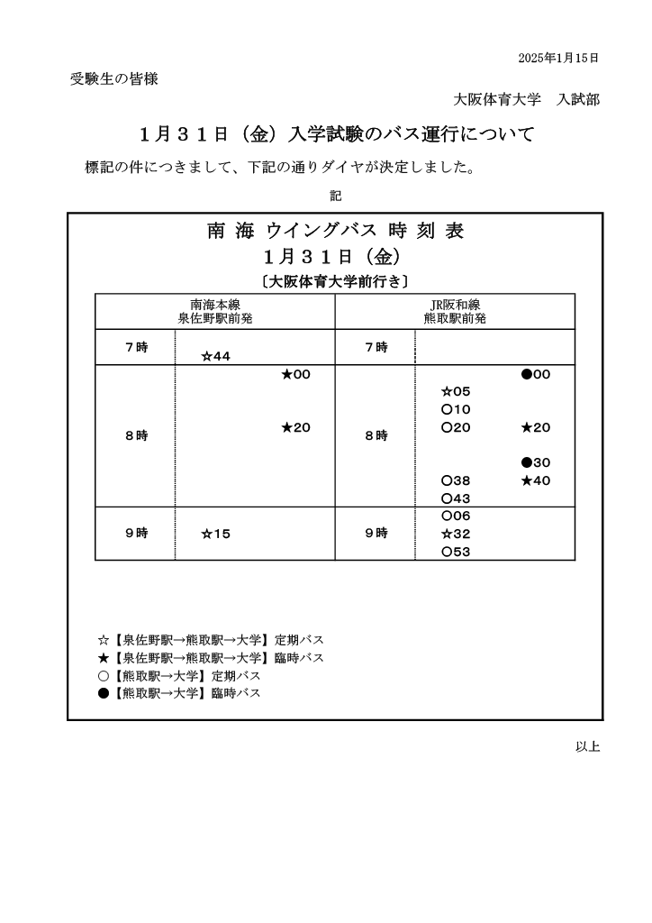 2025.01.15 2025年度 一般選抜?スポーツ特別総合型選抜(第3回)実施日のバス運行について 2025年1月30日(木)?31日(金)入学試験当日のバスダイヤが決定しましたのでお知らせします。 試験場へは、公共交通機関をご利用のうえお越しください。 また、受験者以外は大学へ入構ができませんので、予めご了承ください。