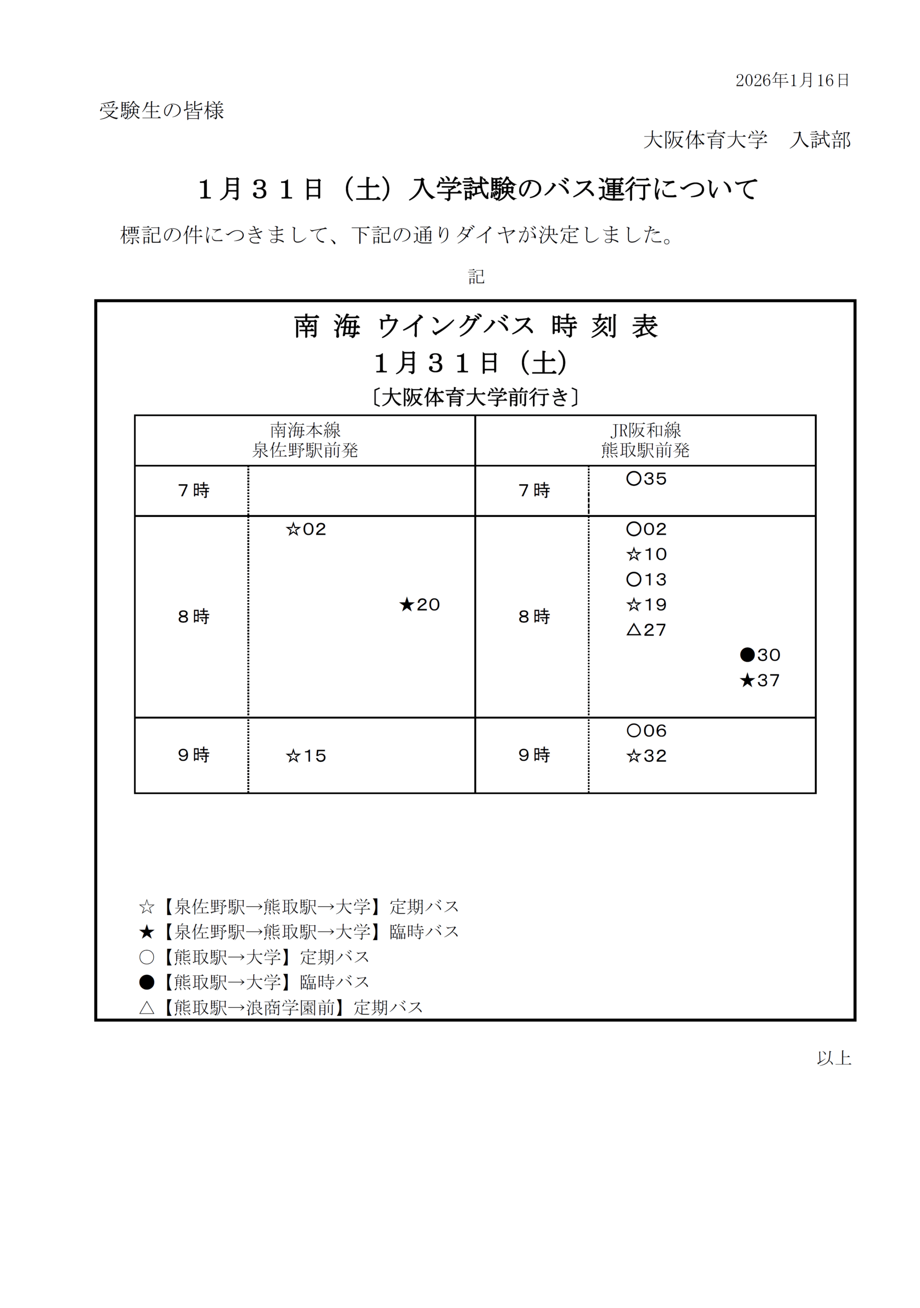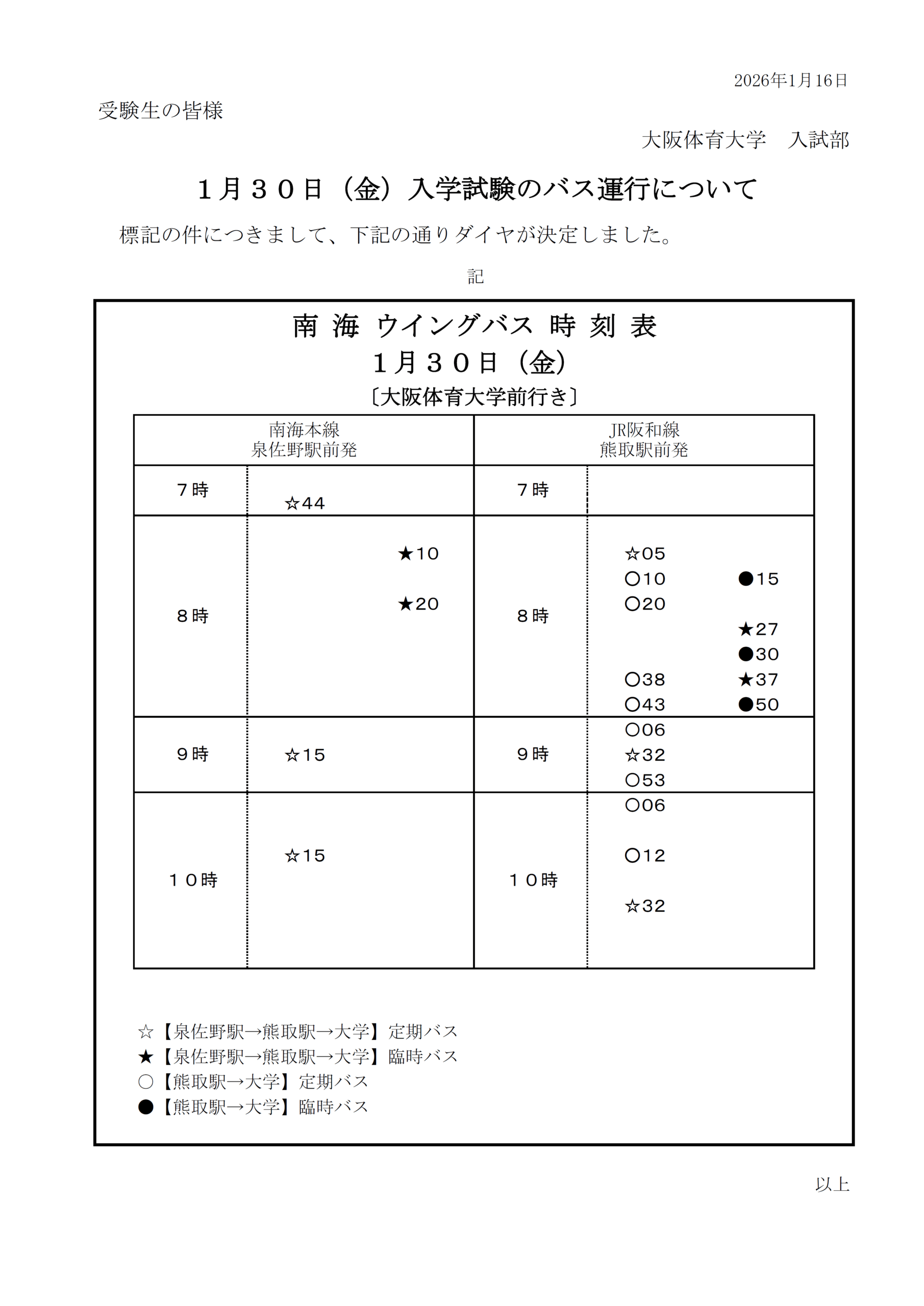 2026.01.19 2026年度 一般選抜?スポーツ特別総合型選抜(第3回)実施日のバス運行について 2026年1月30日(金)?31日(土)入学試験当日のバスダイヤが決定しましたのでお知らせします。 試験場へは、公共交通機関をご利用のうえお越しください。 また、受験者以外は大学へ入構ができませんので、予めご了承ください。